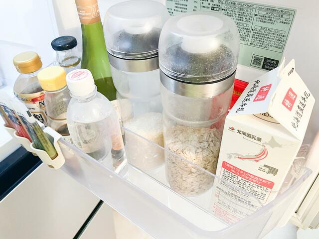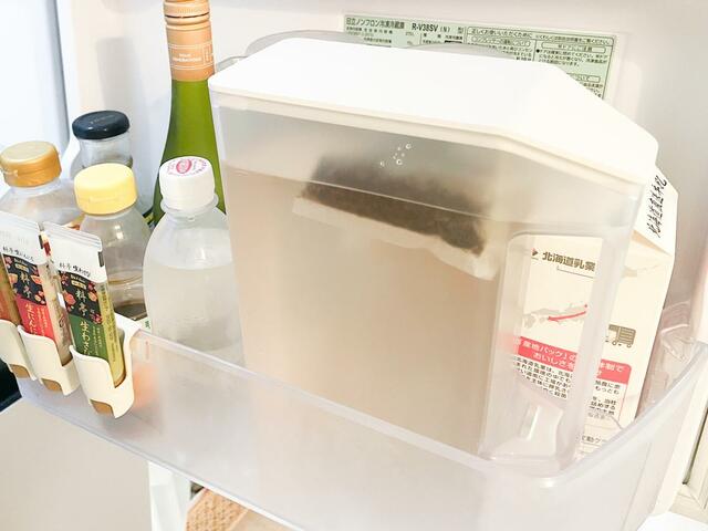 蓋をしたら冷蔵庫へ。できれば取り出しやすい一番手前に入れたいけれど、2Lサイズをドアポケットの1列目に入れるのはさすがに難しいだろうな……。