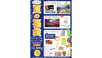 楽久屋は8月9~11日の期間、同社の運営する「佐倉天然温泉 澄流(すみれ)」(千葉県佐倉市)において、入浴回数券や岩盤浴券とともに、豪華な食品を入れた「澄流の夏の福袋」を数量限定(事前予約枠:50個、当日販売分:50個)で販売する。事前予約は8月8日まで受け付けており、価格は1万2500円。