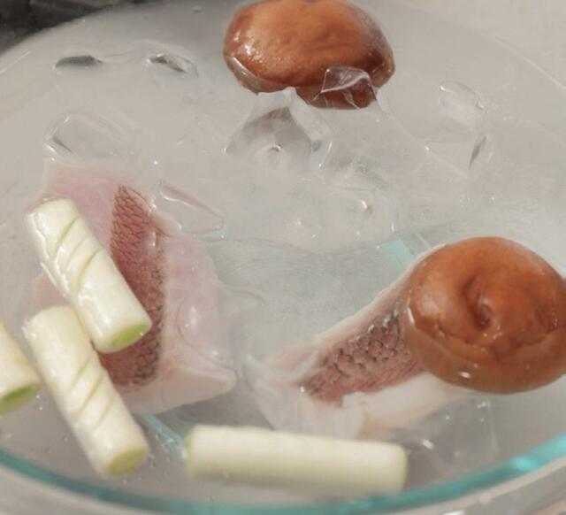 3. 2のしいたけと長ねぎを熱湯に20秒ほど通し、引き上げて水にとる。同じ湯に1の鯛をくぐらせて霜降りにする。