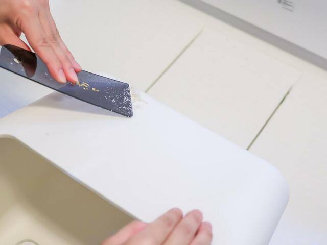 使い方は、石けんカスの部分に対して斜めに当てて優しくこするだけ。