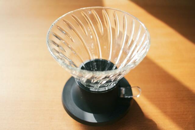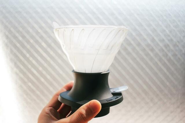 ハリオの定番V60型のガラスドリッパーにシリコーンホルダーを組み合わせたこちら。その特徴的なデザインは優れた機能につながっています。