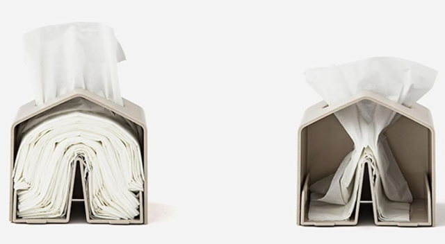 移し替えの方法は、ペーパーをティッシュボックスから取り出し、二つ折りにしながら底フタの部分に乗せ、上からケースを被せるだけ。簡単に中身をそのまま、おうち型ティッシュケースに収めることができます。