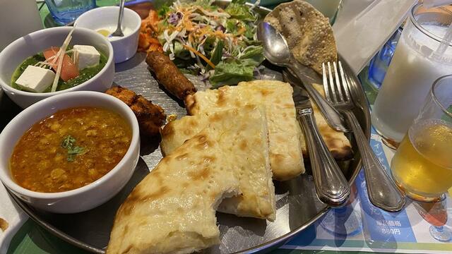 注文したランチプレートは「豆とひき肉のカレー」&「ほうれん草とチーズのカレー」そして「チーズナン」、ケバブ、チキンティカ、サラダ、ヨーグルト、パパド、ラッシー。クラフトビール・KAORI。とても美味しいカレーでした。