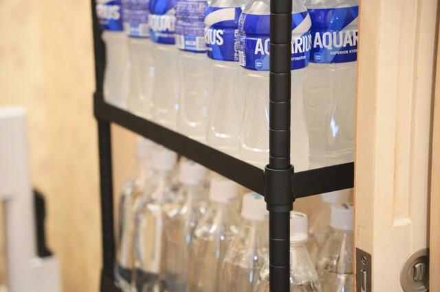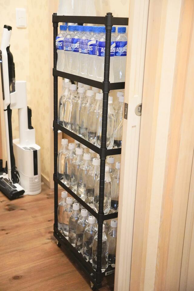 今まではそのへんに適当に置いていたペットボトル。子どもが大きくなって消費量も増え、水は防災アイテムということもあり、数はどんどん増える一方。どう収納すればいいんだろう……と頭を悩ませていました。