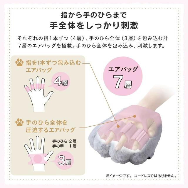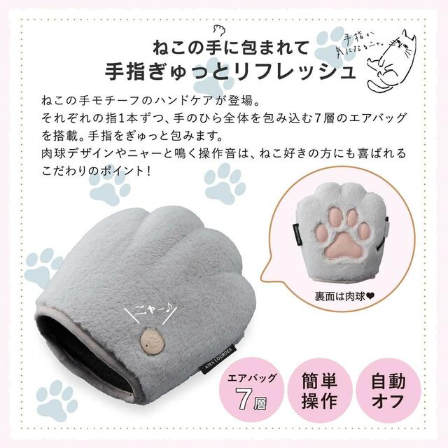 日常生活で酷使している手指を、まるで猫が優しく包み込むように7層のエアバッグが隅々までケアしてくれるのが「ルルド 猫型 ハンドぎゅっと」の特長。
