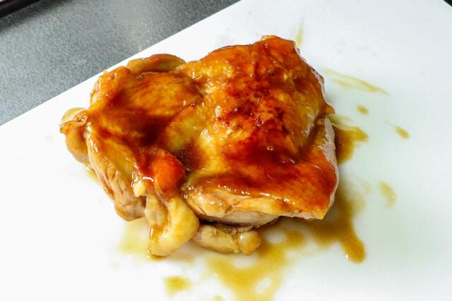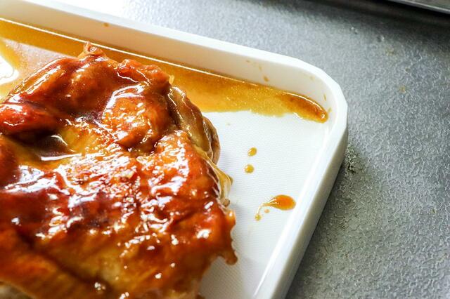 こちらもベタつきがちな、照り焼きチキンをカットしてみます。
