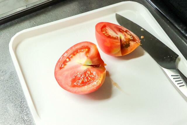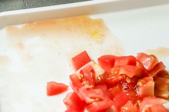 トマトを細かく切ってみると、種や水分がキレイにフチへ流れていきます。