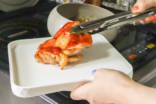 今まではフライパンをまな板の上まで持っていってお肉をのせていたので、危なかったり熱かったりしていたんですよね。