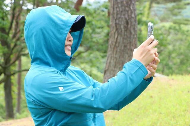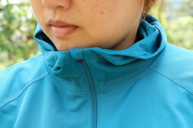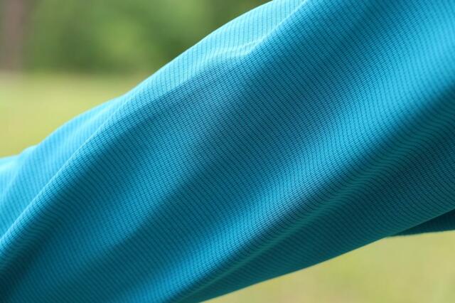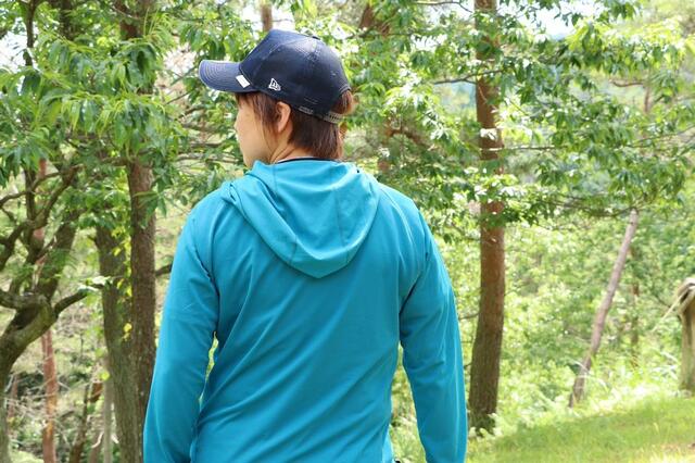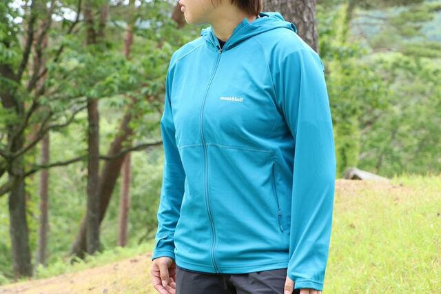 鮮やかで涼しさも感じるターコイズブルーの色合いに惹かれ、モンベルで「クールパーカ」を購入。