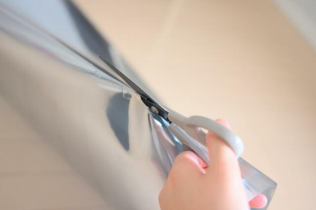 両端に印をつけたらフィルムに折り目をつけ、折り目にそってスーッとハサミを通す方法が楽ちんでおすすめです。
