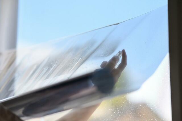 続いて、窓に貼る工程。フィルムと窓に霧吹きで水をつけ、ゴムベラなどを使ってフィルムを窓に密着させていきます。