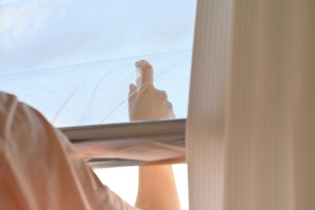 最初にフィルムの貼り付け面についている保護フィルムを剥がすのですが、一度にすべて剥がしてしまうと扱いにくくなるので、私は少しづつ保護フィルムを剥がしながら窓に貼り付けるようにしています。