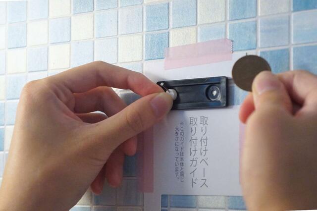 マスキングテープで位置を定めた「取り付けガイド」に「取り付けベース」を押し当て、「ピン」で固定していきます。