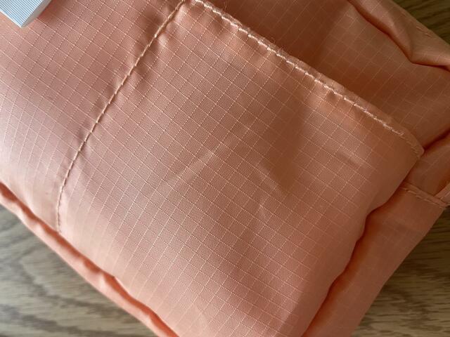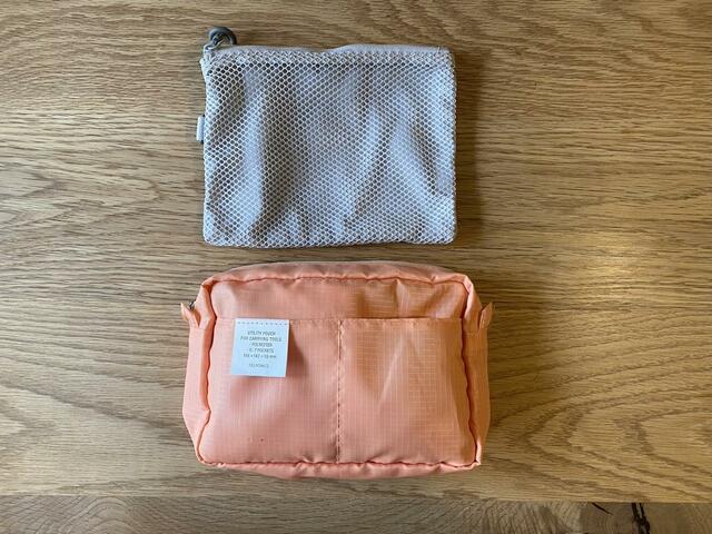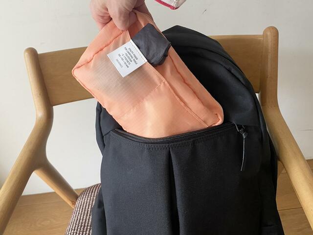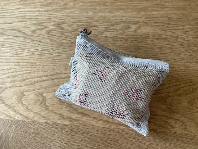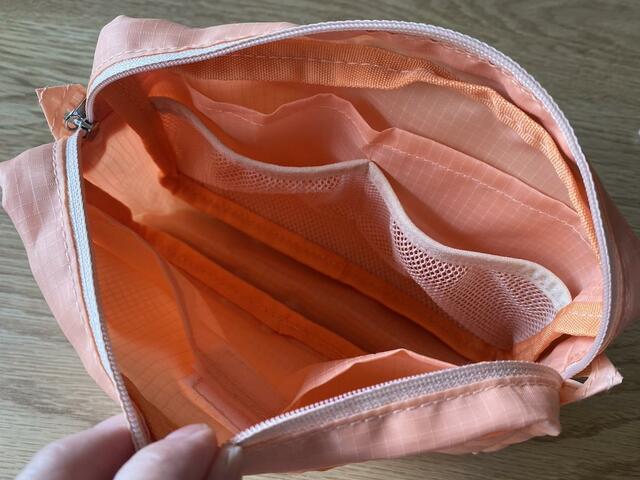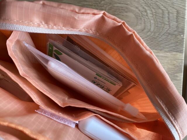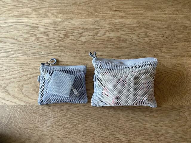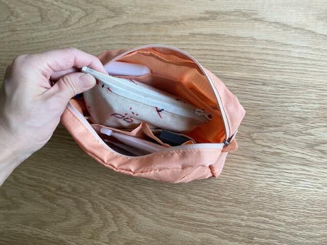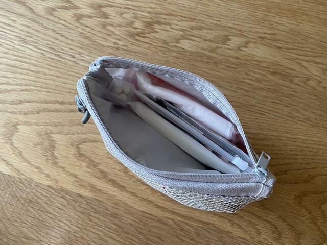 そして、メッシュの方にはメイクポーチをそのままイン。ちょっとだけ特殊な使い方かもしれません。