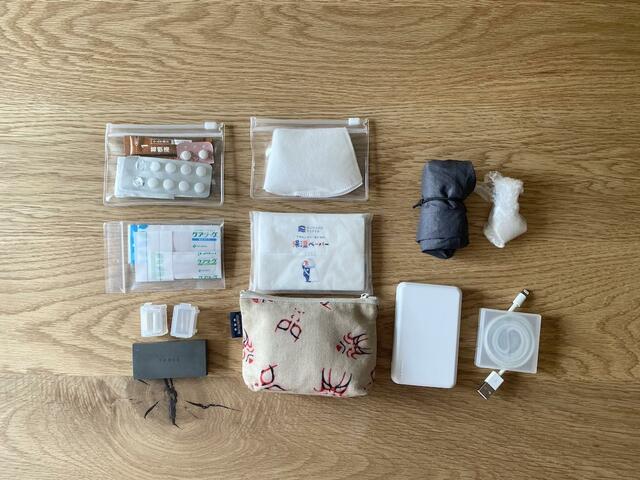 常備薬やサプリ、マスク、ティッシュ、メイクポーチ、追加のメイクアイテム、以前は別にしていた充電バッテリーもこちらに。さらに、エコバッグや意外と使うゴミ袋も。