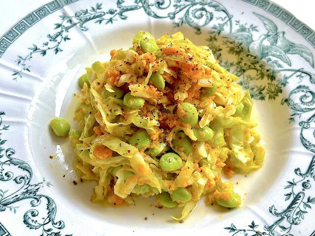 写真は、塩もみしたキャベツと、さやから出した枝豆を人参ドレッシングで和えた一品。グリーンと鮮やかなオレンジがきれいでしょう?