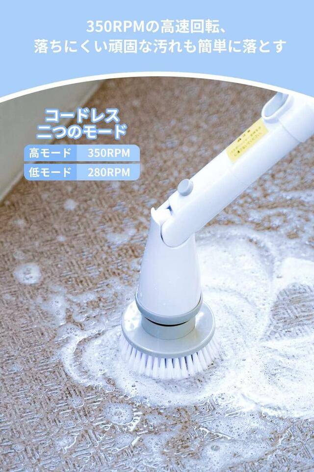 350RPM(=1分間で350回転)に達する高速回転なので、余計な力を入れずに洗剤を泡立て、浴槽や浴室の床を傷つけないよう、奇麗に汚れを落とすことが可能です。「電動掃除ブラシだと、隣近所への騒音が心配」といった方でも、運転音を抑えた低騒音モデルとなっているため問題なく利用できますよ。