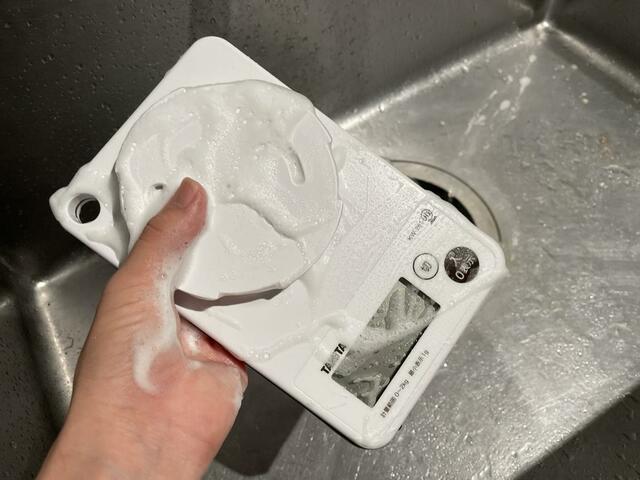だって、「洗えるクッキングスケール」は、防水仕様 (IP65) 。計量皿を取り外せるうえ、食器用の中性洗剤を使って丸ごとざぶっと洗えるんですから!