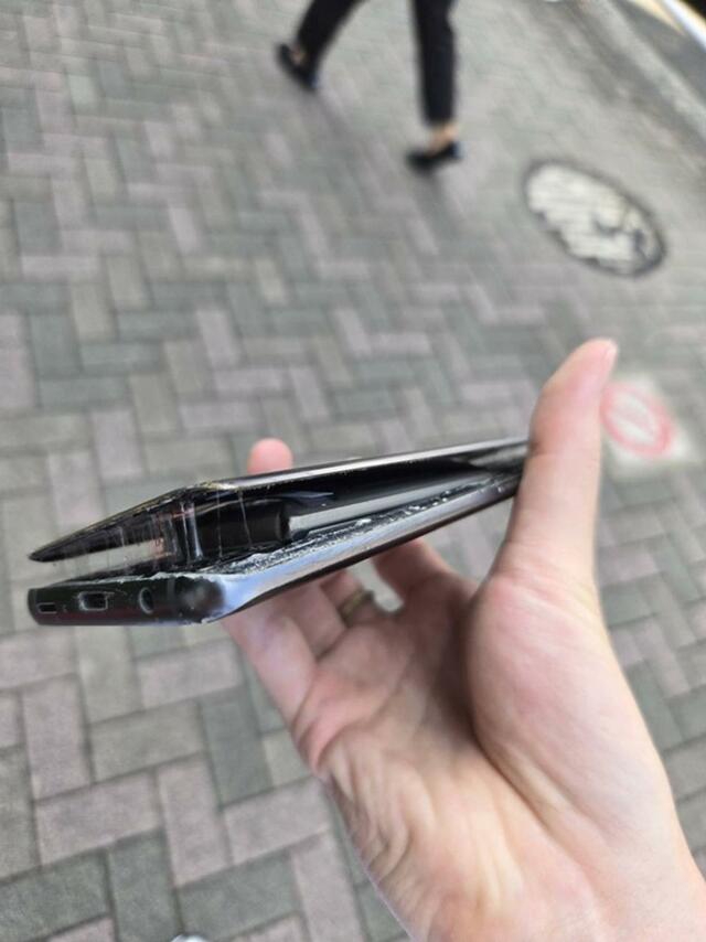 膨れたバッテリーに衝撃を加えぬよう、ハンカチに包んだスマホを手にそ~っと歩く男の姿。周囲の人々には奇妙に映ったことでしょう。