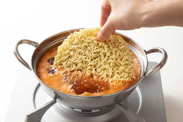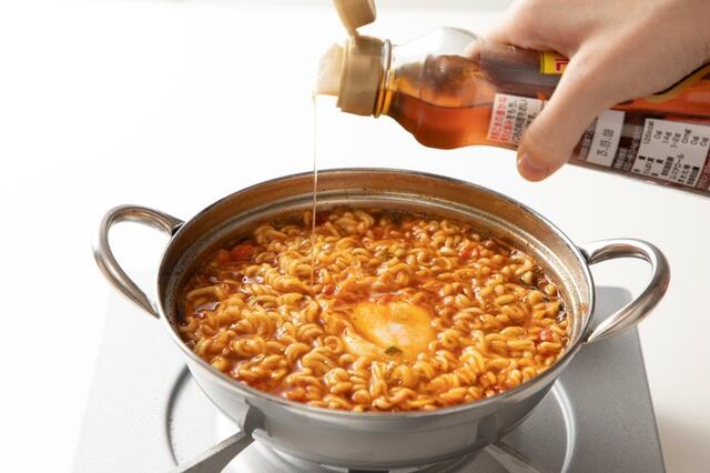 もともと濃厚なイメージがある「辛ラーメン」に、さらにコチュジャンとみりんをプラスする……という、このレシピ。