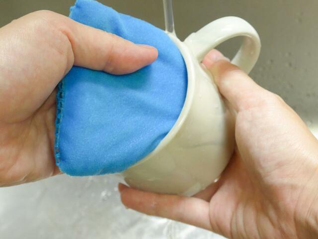 水で流しながら、やわらかいクロス面でマグカップをくるくると磨いていきます。力加減は、いつもの食器洗いと変わらない程度。