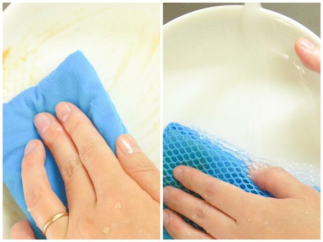 ネット面で、食べ残しやこびりつきを軽くこそげ落として、水を流しながらクロス面で磨くように洗うだけ。