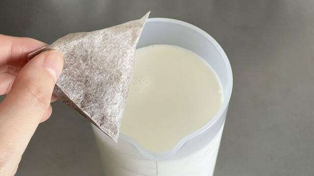 500mlの牛乳に直接ティーバッグを1個入れて、2〜3時間冷蔵庫で冷やすだけで完成です。