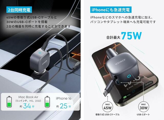 Anker(アンカー)の車載充電器「Nano Car Charger(75W,巻取り式 USB-Cケーブル)」は、ドライバーも同乗者も助かる画期的なアイテムです。