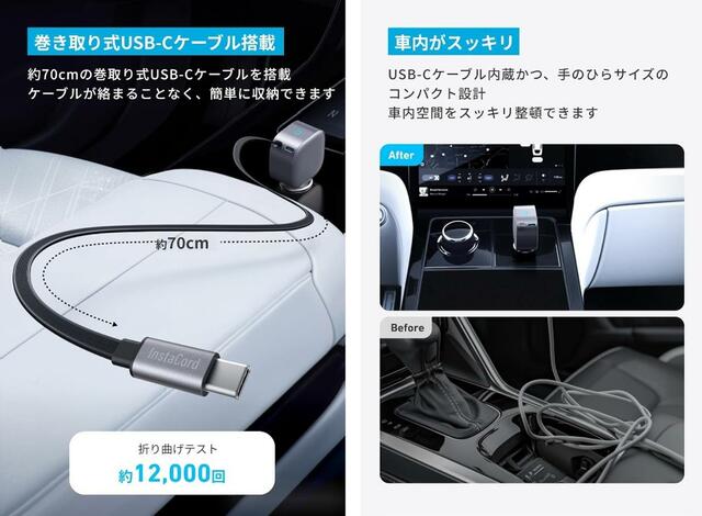 Anker史上初となるUSBケーブル搭載、しかも巻取り式で収納できるため、車内がスッキリしますよ!
