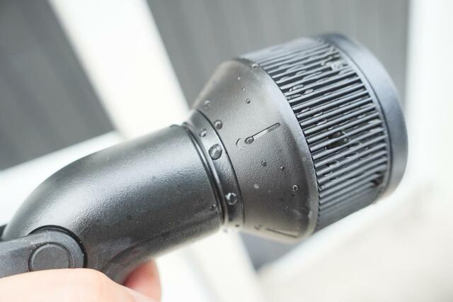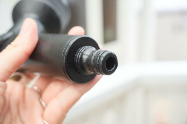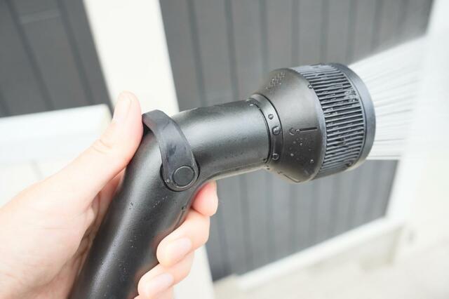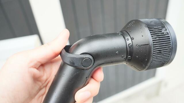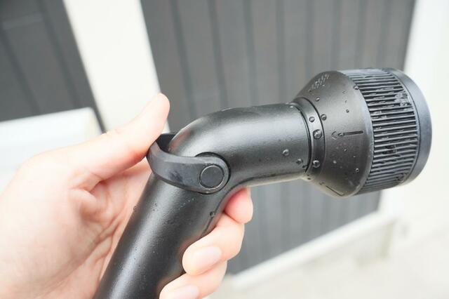 まずビックリしたのが、この持ち手の部分を押したり引いたりすることで散水できるということ。一般的な散水ノズルはスイッチを握ったり緩めたりすることが切り替えますが、この押し引きで操作するのが思った以上に便利でした。