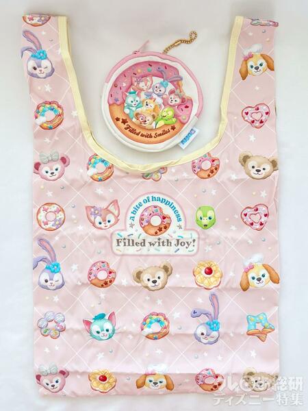 バッグ:薄いピンク地にお星さまや飾りが散りばめられ、白の斜めの格子、角部分にダッフィーたちのお顔とドーナツが交互に並んでいます。