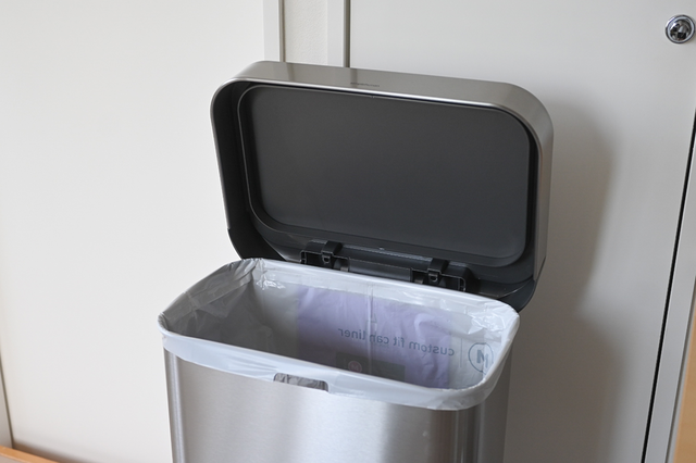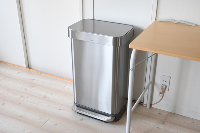 選んだのは、「レクタンギュラーステップカン」。ペダル式で開閉できるタイプで、両手が塞がっていても開けられるのが特徴です。