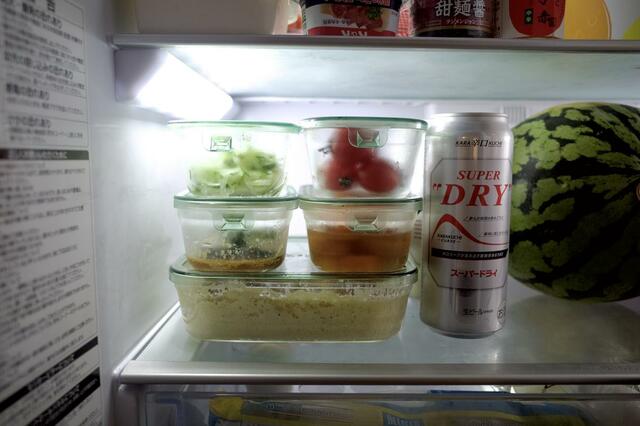 3段に重ねても500mlの飲料缶と同程度のサイズなので、たくさん作りおきしてもスッキリ収納可能です。冷蔵庫のスペースの節約にもなりました。