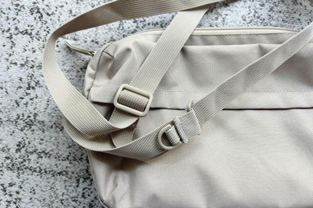 無印良品の「背面ポケット付き 撥水ショルダーバッグ」の魅力は、まずそのシンプルさ。無印良品らしい無駄のないデザインで、ファッションに自然に馴染みます。