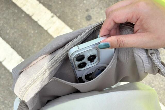 ファスナーはないものの、スマホや交通系ICカードなど、すぐに取り出したいものを入れるのにちょうど良いサイズ感。出し入れがとにかくラクなんです!