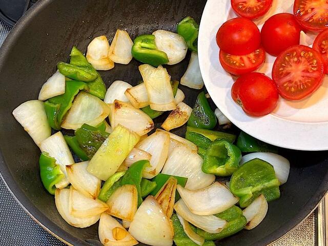 5. 塩(小さじ1/3)をふり、玉ねぎが少ししんなりしてくるまで炒めたら、ミニトマトを加える。この時点で砂糖を振り、ミニトマトが柔らかくなって形が崩れるくらいまで炒める。