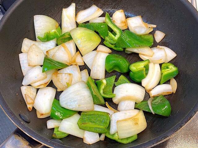 4. なすとズッキーニをいったん取り出し、フライパンにオリーブオイル(大さじ1)を足したら、玉ねぎとピーマンを炒める。