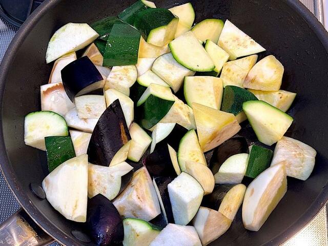 3. オイルがあたたまってにんにくの香りが出てきたら、まずなすとズッキーニを加えて炒める。全体にオリーブオイルがいきわたるように混ぜながら、ややしんなりして焼き色がつくまで炒める。