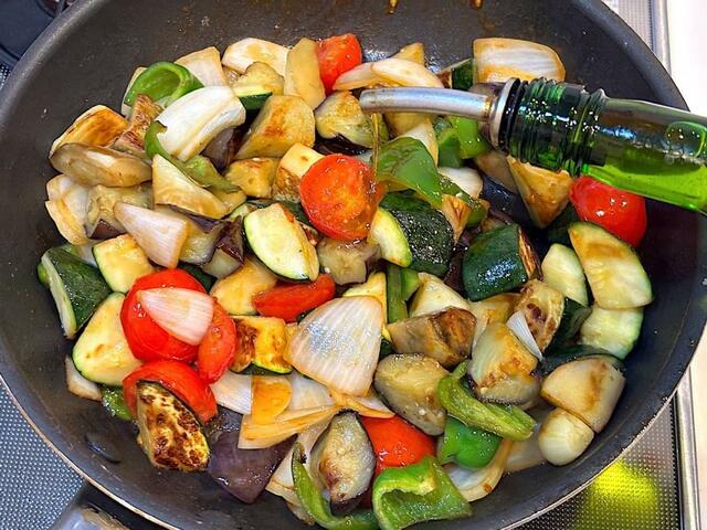 オリーブオイルで野菜たちがツヤッとなるようにたっぷり使って欲しいので、美味しいオリーブオイルを準備するといいですね。