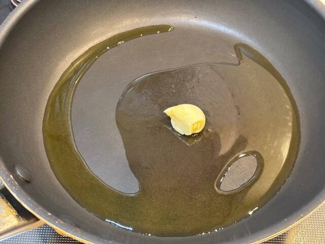 2. 皮を剥いて包丁の背で潰したにんにくをフライパンに入れ、オリーブオイル(大さじ2)を加えて火にかける。