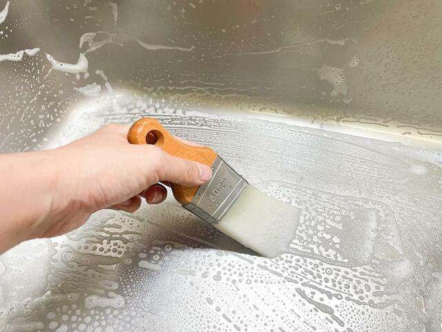 シンクを掃除しているうちにブラシについた頑固な油汚れは落ちているので、最後に少量の洗剤で洗えばキレイな状態をキープできますよ。