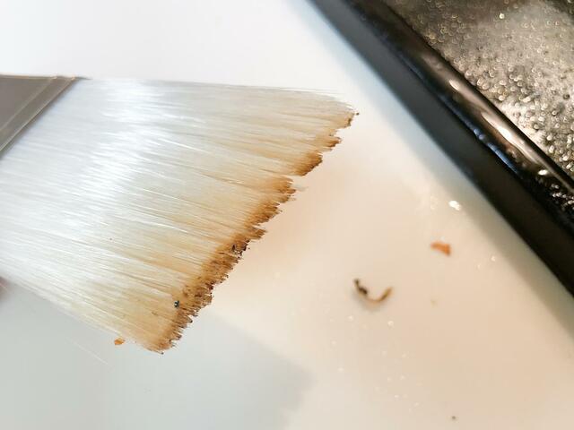 小刻みに動かしていると、小さなゴミがポロポロ出てきました。ブラシの先も油汚れで茶色に。