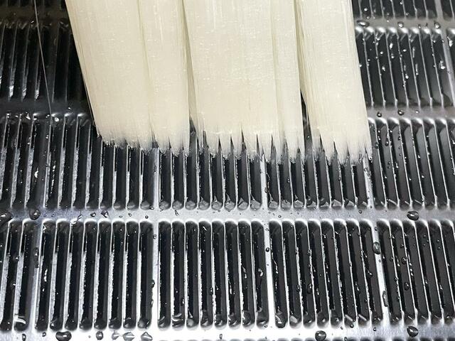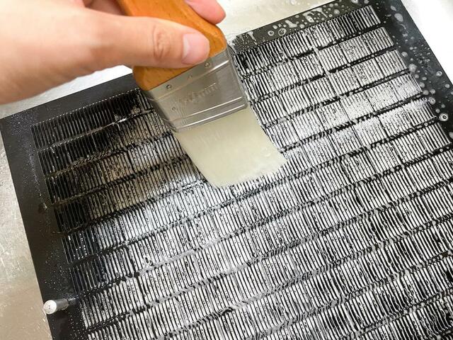 網目が細かい換気扇のフィルター。ちょっと掃除をサボると油汚れが溜まって、洗剤に浸して、ブラシでこすって……と、意外と時間も労力もかかります。