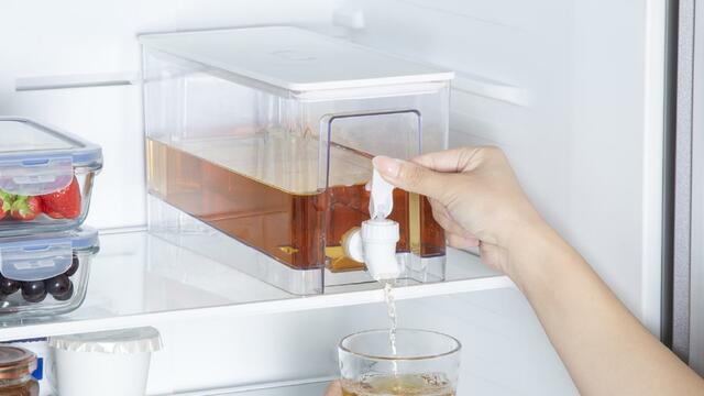 冷蔵庫の棚に収納できるドリンクサーバーで、冷蔵庫から取り出さずにそのまま飲み物が注げるという優れもの。