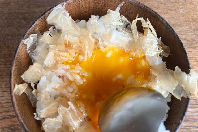 作り方は、ご飯に卵をのけて、鰹節をまぶし、あとは醤油をひとまわしするだけ。