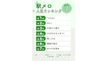 ジャパニスタは8月13日に、公式SNSにて実施した「好きな駅メロ」アンケートの集計結果に基づく、人気駅メロランキングTOP7を発表した。同調査は6月に行われ、3656件の有効回答を得ている。