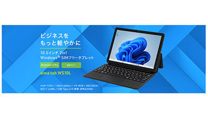 アイワマーケティングジャパンは8月21日に、「aiwa」ブランドから、ビジネスユースに対応する性能とインターフェイスを兼ね備えた、10.5インチの2in1 Windows SIMフリータブレット端末「aiwa tab WS10L」の、法人限定モデルとしての販売を、ダイワボウ情報システムとTD SYNNEXにて開始した。価格はオープンで、実勢価格は6万9800円前後。