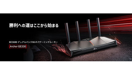 「Archer GE230」は、IEEE802.11be(Wi-Fi 7)や4K-QAM・MLOなどに対応し、2882Mbps(5GHz・規格値)+688Mbps(2.4GHz・規格値)の高速無線通信に対応するとともに、本体に2.5GbpsのWAN/LANポートを搭載したゲーミング無線LANルーター。ギガビットイーサネットの約2.5倍に相当する通信速度によって、無線・有線を問わず安定性と高速性の両立を実現している。