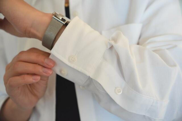 肌触りがよいコットンレーヨン混素材で、わりと厚手なつくりなのですが、羽織ってみると軽く感じる着心地です。袖口は調整できるダブルのボタン付きで、わたしは袖ボタンは留めたままめくったりして着ています。