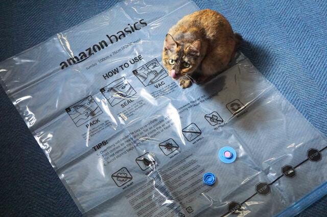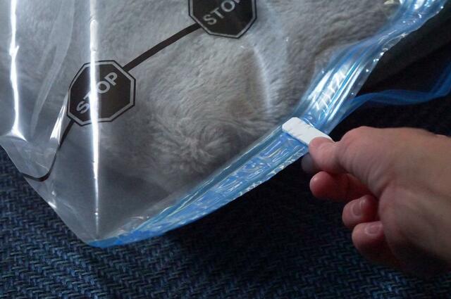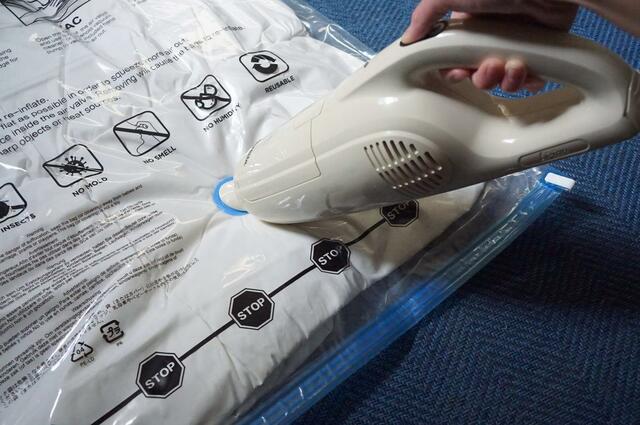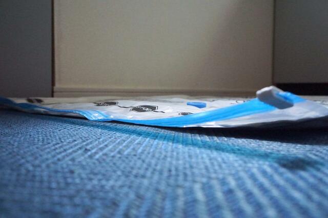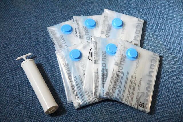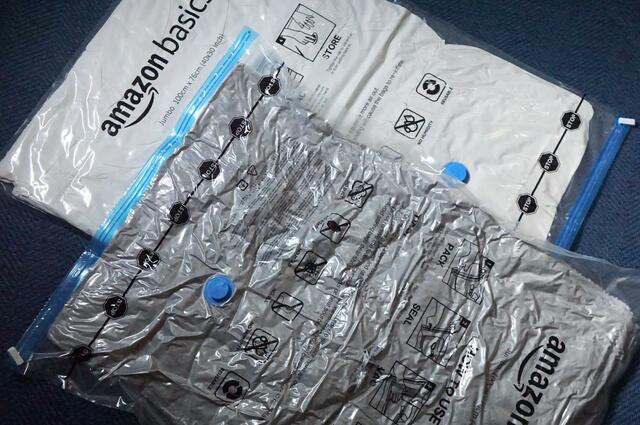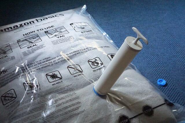 存在自体はお馴染みのアイテムですが、Amazonベーシックの「衣類圧縮袋」は、ハンドポンプが付いていて、掃除機なしでも圧縮が可能。